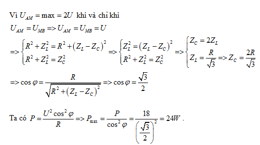 Cho mạch điện như hình bên. Đặt vào hai đầu AB một điện áp xoay chiều có giá trị hiệu dụng U và tần số f không đổi. Điều chỉnh C để tổng điện áp hiệu dụng UAM + UMB lớn nhất thì tổng đó bằng 2U và khi đó công suất tiêu thụ của đoạn mạch AM là 18 W. Tiếp tục điều chỉnh C để công suất tiêu thụ của đoạn mạch lớn nhất thì công suất lớn nhất đó bằng