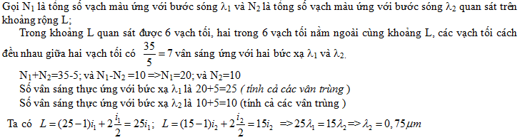 Trong thí nghiệm về giao thoa ánh sáng Young, ánh sáng chiếu đến hai khe gồm hai ánh sáng đơn sắc có bước sóng \({\lambda _1} = 0,45\,\,\mu m\) và \({\lambda _2}\). Trong khoảng rộng L trên màn qua sát được 35 vạch sáng và 6 vạch tối. Biết hai trong 6 vạch tối đó nằm ngoài cùng khoảng L và tổng số vạch màu của \({\lambda _1}\) nhiều hơn tổng số vạch màu của \({\lambda _2}\) là 10. Tính \({\lambda _2}\)