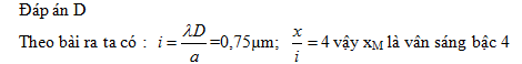 Trong thí nghiệm Young về giao thoa ánh sáng, khoảng cách giữa hai khe S1,S2 là 2 mm, khoảng cách từ S1S2 đến màn quan sát là 3 m, bước sóng ánh sáng làm thí nghiệm là \(0,5\,\,\mu m\) Tại điểm M trên màn, có toạ độ xM = 3 mm là vị trí