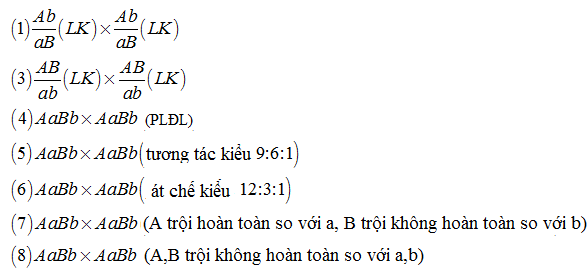 Ở một loài thực vật, xét 2 locut gen nằm trong nhân tế bào, mỗi gen đều có 2 alen. Người ta cho lai giữa hai cây (P) đều thuần chủng khác nhau về 2 cặp gen tương phản, thu được F1. Tiếp tục cho F1 tự thụ phấn thu được đời F2. Biết rằng không phát sinh đột biến mới và nếu có hoán vị gen thì đều xảy ra ở cả quá trình tạo hạt phấn và tạo noãn với tần số 50%. Giả sử sức sống các kiểu gen như nhau, sự biểu hiện tính trạng không phụ thuộc vào môi trường. Theo lý thuyết, trong số các trường hợp phát sinh tỉ lệ kiểu hình sau đây, có bao nhiêu trường hợp có thể xảy ra ở đời F2?