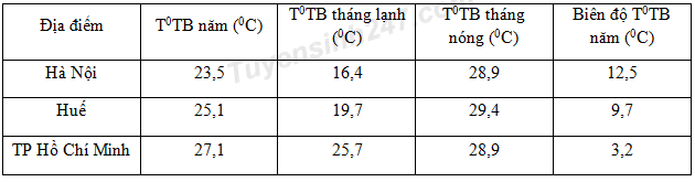 Bảng số liệu nhiệt độ trung bình năm, nhiệt độ trung bình tháng nóng, tháng lạnh và biên độ nhiệt trung bình năm của 3 địa điểm Hà Nội, Huế, TP HCM.