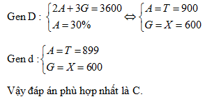 Gen D có 3600 liên kết hiđrô và số nuclêôtit loại ađênin (A) chiếm 30% tổng số nuclêôtit của
