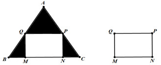 Cho một tấm nhôm hình tam giác đều có cạnh bằng 20 (cm). Người ta cắt ở ba góc của tấm nhôm đó ba tam giác như hình vẽ dưới đây để được hình chữ nhật \(MNPQ\). Tìm độ dài đoạn \(M B\) để hình chữ nhật \(M N P Q\) có diện tích lớn nhất.
