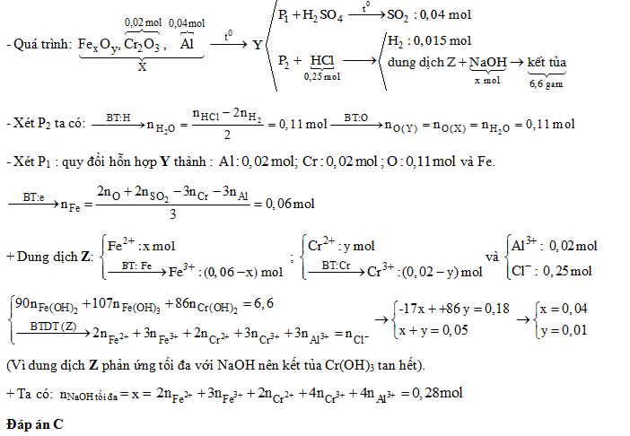 Thực hiện phản ứng nhiệt nhôm hỗn hợp X chứa một oxit sắt, 0,02 mol Cr2O3 và 0,04 mol Al sau một thời gian thu được hỗn hợp chất rắn Y. Chia Y thành hai phần bằng nhau. Phần 1 tác dụng với H2SO4 đặc nóng dư thu được 0,896 lít SO2 ở (đktc, sản phẩm khử duy nhất). Phần 2 tác dụng vừa đủ 250 ml dung dịch HCl 1M thu được dung dịch Z và 0,336 lít H2 ở (đktc), dung dịch Z tác dụng tối đa x mol NaOH thu được 6,6 gam hỗn hợp kết tủa. Biết các phản ứng xảy ra hoàn toàn. Giá trị của x là: