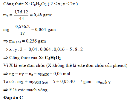 Đốt cháy 0,8 gam một este X đơn chức được 1,76 gam CO2 và 0,576 gam H2O. Cho 5 gam X tác dụng với lượng NaOH vừa đủ, cô cạn dung dịch sau phản ứng được 7 gam muối khan Y. Cho Y tác dụng với dung dịch axit loãng thu được Z không phân nhánh. Công thức cấu tạo của X là:
