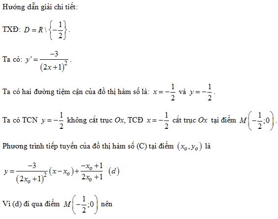 Xác định các đường tiệm cận của đồ thị hàm số sau đó suy ra tọa độ giao điểm của các đường tiệm cận với trục \(Ox.\)
