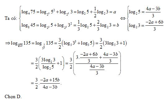 +) Sử dụng các công thức của hàm số logarit để biến đổi biểu thức \(\log_4 75\) và \( \log_8 45\) theo biểu thức \(\log_2 5\) và \( \log_2 3.\)