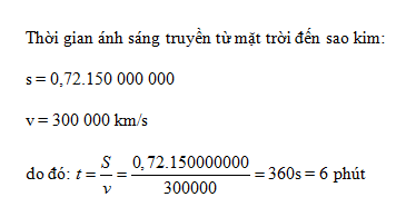 Khoảng cách từ sao Kim đến Mặt Trời bằng 0,72 đơn vị thiên văn (đvtv). Biết 1 đvtv = 150 000 000km, vận tốc ánh sáng bằng 300 000km/s. Tính thời gian ánh sáng truyền từ Mặt Trời tới sao Kim