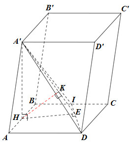Cho lăng trụ \(ABCD.A'B'C'D'\)có đáy là hình vuông cạnh \(a\), cạnh bên \(AA' = a\) , hình chiếu vuông góc của \(A'\) trên mặt phẳng \(\left( {ABCD} \right)\) trùng với trung điểm H của AB. Gọi I là trung điểm của \(BC\). Khoảng cách từ H đến \(\left( {A'ID} \right)\) là: