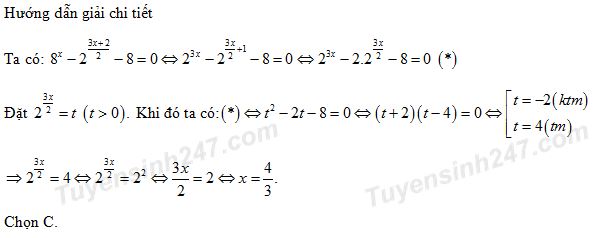 Nghiệm của phương trình \({8^x} - {2^{\frac{{3x + 2}}{2}}} - 8 = 0\) là: