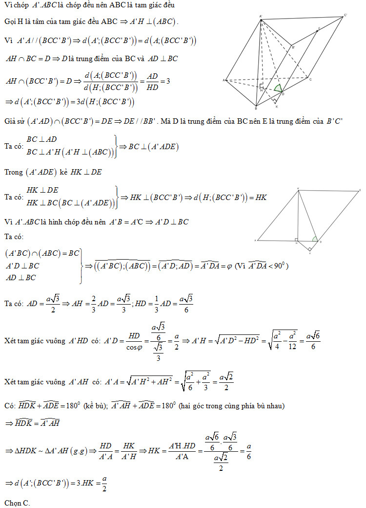 Cho hình lăng trụ \(ABC.A'B'C'\) có \(A'.ABC\) là hình chóp đều, \(AB = a\). Gọi \(\varphi \) là góc giữa hai mặt phẳng \(\left( {A'BC} \right)\) và mặt phẳng \(\left( {ABC} \right)\) với \({\rm{cos}}\varphi {\rm{ = }}\frac{{\sqrt 3 }}{3}\). Gọi H là tâm mặt đáy (ABC). Khoảng cách từ điểm A’ đến mặt phẳng \(\left( {BCC'B'} \right)\)?