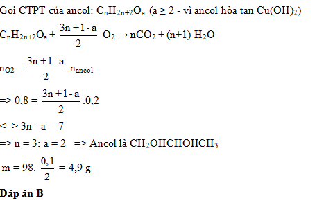 Đốt cháy hoàn toàn 0,2 mol một ancol X no, mạch hở cần vừa đủ 17,92 lít khí O2 (ở đktc). Mặt khác, nếu cho 0,1 mol X tác dụng vừa đủ với m gam Cu(OH)2 thì tạo thành dung dịch có màu xanh lam. Giá trị của m và tên gọi của X tương ứng là
