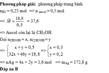 Cho 18,8 gam hỗn hợp M gồm C2H5OH và một ancol đồng đẳng X tác dụng với Na dư thu được 5,6 lít khí H2 (đktc). Oxi hóa 18,8 gam M bằng CuO, nung nóng thu được hỗn hợp Y gồm 2 anđehit (h=100%). Cho Y tác dụng hết với dung dịch AgNO3 trong NH3 , thu được m gam Ag. Giá trị của m là: