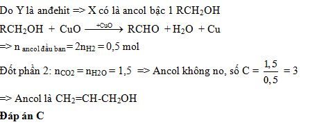 Oxi hóa ancol đơn chức X thu được anđehit Y. Hỗn hợp khí và hơi sau phản ứng được chia thành 2 phần bằng nhau. Phần 1 cho tác dụng với Na dư, thu được 5,6 lít khí H2 (đktc). Phần 2 đốt cháy hoàn toàn, thu được 33,6 lít khí (đktc) CO2 và 27 gam H2O. Tên gọi của X là: