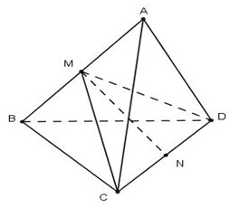 Cho tứ diện \(ABCD\) có\(AB = CD = a;AC = BD = b;AD = BC = c\). Khoảng cách giữa hai đường thẳng \(AB\) và \(CD\) là: