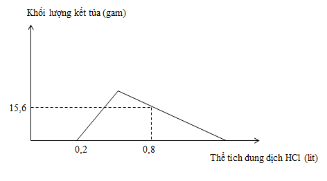 Hòa tan hoàn toàn m gam hỗn hợp X gồm Ba, BaO, Al và Al2O3 vào nước dư, thu được dung dịch Y và 5,6 lit khí H2 (dktc). Nhỏ từ từ đến dư dung dịch HCl 1M vào dung dịch Y. Đồ thị biểu diễn sự phụ thuộc khối lượng kết tủa Al(OH)3theo thể tích dung dịch HCl như sau :