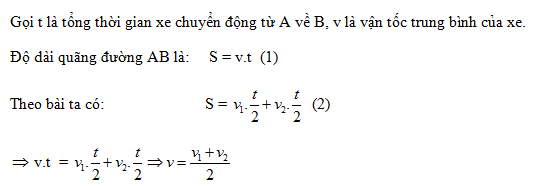 Một xe chuyển động từ A về B. Nửa thời gian đầu vận tốc của xe là v1, nửa thời gian sau vận tốc của xe là v2. Tính vận tốc trung bình của xe trên cả quãng đường AB.