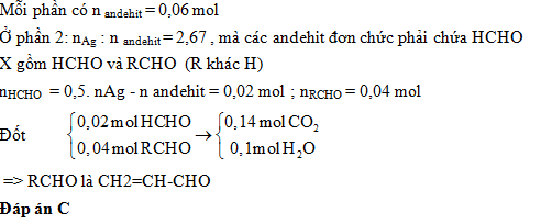 X là hỗn hợp 2 anđehit đơn chức. Chia 0,12 mol X thành hai phần bằng nhau :