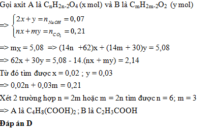 Hỗn hợp X gồm hai axit hữu cơ no mạch hở, hai lần axit (A) và axit không no (có một nối đôi) mạch hở, đơn chức (B). Số nguyên tử cacbon trong phân tử chất này gấp đôi số nguyên tử cacbon trong phân tử chất kia. Đốt cháy hoàn toàn 5,08 gam hỗn hợp X được 4,704 lít CO2 (đo ở đktc). Nếu trung hòa hết 5,08 gam X cần 350 ml dung dịch NaOH 0,2 M được hỗn hợp muối Y. Công thức cấu tạo thu gọn của A và B là: