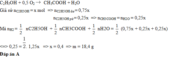 Thực hiện phản ứng oxi hóa m gam ancol etylic nguyên chất thành axit axetic (hiệu suất phản ứng đạt 25%) thu được hỗn hợp Y, cho Y tác dụng với Na dư thu được 5,6 lít H2 (đktc). Giá trị của m là