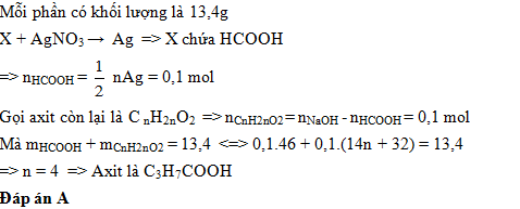 Hòa tan 26,8 gam hỗn hợp hai axit cacboxylic no, đơn chức, mạch hở vào nước được dung dịch X. Chia X thành hai phần bằng nhau. Cho phần 1 phản ứng hoàn toàn với dung dịch AgNO3/NH3 dư thu được 21,6 gam bạc kim loại. Để trung hòa hoàn toàn phần 2 cần 200,0 ml dung dịch NaOH 1,0M. Công thức của hai axit đó là
