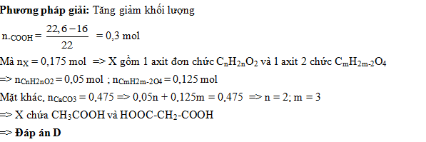 Hỗn hợp X gồm hai axit hữu cơ no (mỗi axit chứa không quá 2 nhóm -COOH) có khối lượng 16g tương ứng với 0,175 mol. Đốt cháy hoàn toàn hỗn hợp X rồi cho sản phẩm cháy qua nước vôi trong dư thu được 47,5 g kết tủa. Mặt khác, nếu cho hỗn hợp X tác dụng vừa đủ với dung dịch Na2CO3 thu được 22,6 g muối. Công thức cấu tạo của các axit trong hỗn hợp X là: