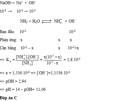 Tính pH của dung dịch gồmNaOH 10-3M và NH3 10-2M (NH3 có Kb = 1,8.10-5 )