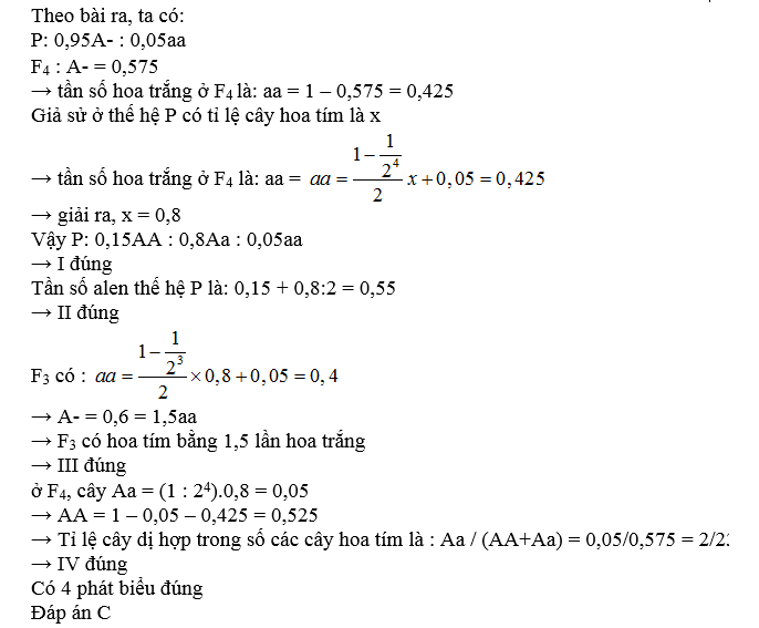 Một quần thể thực vật lưỡng bội, alen A quy định hoa tím trội hoàn toàn so với alen a quy định hoa trắng. Thế hệ xuất phát (P) của quần thể này có số cây hoa trắng chiếm 5%. Sau 4 thế hệ tự thụ phấn, thu được F4 có số cây hoa tím chiếm 57,5%. Biết rằng quần thể không chịu tác động của các nhân tố tiến hóa khác. Theo lí thuyết, có bao nhiêu phát biểu sau đây đúng?