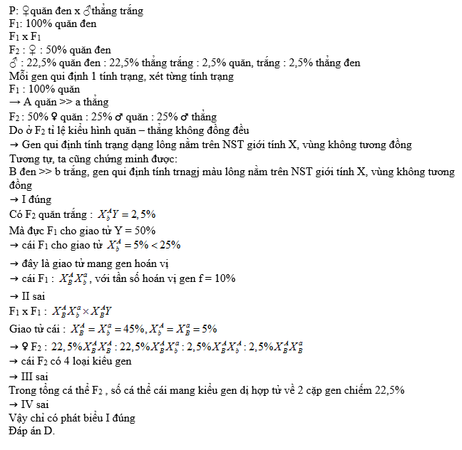 Một loài thú, cho cá thể cái lông quăn, đen giao phối với cá thề đực lông thẳng, trắng (P), thu được F1 gồm 100% cá thể lông quăn, đen. Cho F1 giao phối với nhau, thu được F2 có kiểu hình phân li theo tỉ lệ: 50% cá thể cái lông quăn, đen : 22,5% cá thể đực lông quăn, đen : 22,5% cá thề đực lông thẳng, trắng : 2,5% cá thể đực lông quăn, trắng : 2,5% cá thể đực lông thẳng, đen. Cho biết mỗi gen quy định một tính trạng và không xảy ra đột biến. Theo lí thuyết, có bao nhiêu phát biểu sau đây đúng?