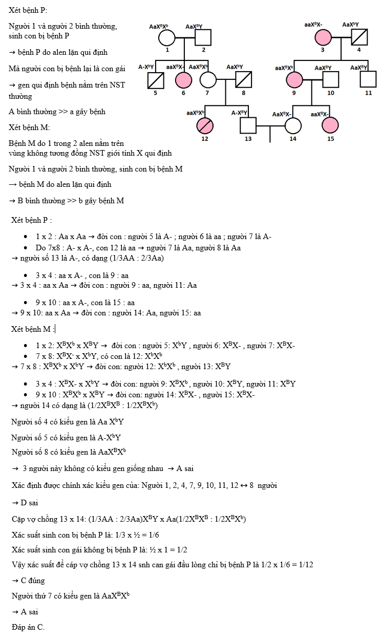 119. Phả hệ ở hình bên mô tả sự di truyền 2 bệnh ở người: Bệnh P do một trong hai alen của một gen quy định; bệnh M do một trong hai alen của một gen nằm ở vùng không tương đồng trên nhiễm sắc thể giới tính quy định.