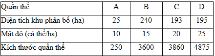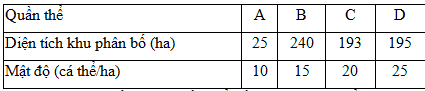 Giả sử 4 quần thể của một loài thú được kí hiệu là A, B, C, D có diện tích khu phân bố và mật độ cá thể như sau: