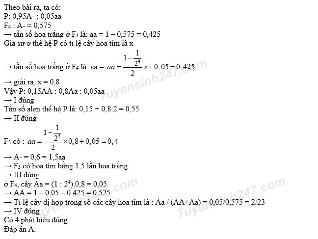 Một quần thể thực vật lưỡng bội, alen A quy định hoa tím trội hoàn toàn so với alen a quy định hoa trắng. Thế hệ xuất phát (P) của quần thể này có số cây hoa trắng chiếm 5%. Sau 4 thế hệ tự thụ phấn, thu được F4 có số cây hoa tím chiếm 57,5%. Biết rằng quần thể không chịu tác động của các nhân tố tiến hóa khác. Theo lí thuyết, có bao nhiêu phát biểu sau đây đúng?