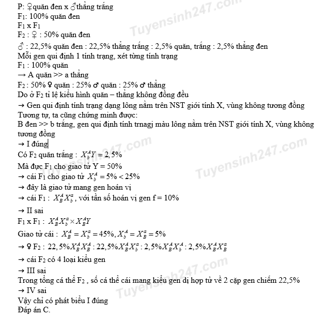 Một loài thú, cho cá thể cái lông quăn, đen giao phối với cá thề đực lông thẳng, trắng (P), thu được F1 gồm 100% cá thể lông quăn, đen. Cho F1 giao phối với nhau, thu được F2 có kiểu hình phân li theo tỉ lệ: 50% cá thể cái lông quăn, đen : 22,5% cá thể đực lông quăn, đen : 22,5% cá thề đực lông thẳng, trắng : 2,5% cá thể đực lông quăn, trắng : 2,5% cá thể đực lông thẳng, đen. Cho biết mỗi gen quy định một tính trạng và không xảy ra đột biến. Theo lí thuyết, có bao nhiêu phát biểu sau đây đúng?
