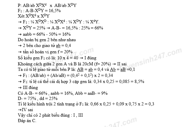 , thu được F1. Trong tổng số cá thể ở F1, số cá thể đực có kiểu hình trội về cả ba tính trạng chiếm 16,5%. Cho biết mỗi gen quy định một tính trạng, các alen trội là trội hoàn toàn; không xảy ra đột biến nhưng xảy ra hoán vị gen ở cả quá trình phát sinh giao tử đực và giao từ cái với tần số bằng nhau. Theo lí thuyết, có bao nhiêu phát biểu sau đây đúng?