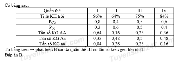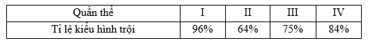 Một loài sinh vật ngẫu phối, xét một gen có hai alen nằm trến nhiễm sắc thể thường, alen A trội hoàn toàn so với alen a. Bốn quần thể của loài này đều đang ở trạng thái cân bằng di truyền và có tỉ lệ cá thể mang kiểu hình trội như sau: