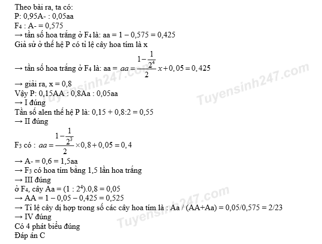 Một quần thể thực vật lưỡng bội, alen A quy định hoa tím trội hoàn toàn so với alen a quy định hoa trắng. Thế hệ xuất phát (P) của quần thể này có số cây hoa trắng chiếm 5%. Sau 4 thế hệ tự thụ phấn, thu được F4 có số cây hoa tím chiếm 57,5%. Biết rằng quần thể không chịu tác động của các nhân tố tiến hóa khác. Theo lí thuyết, có bao nhiêu phát biểu sau đây đúng?