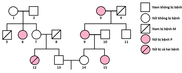 Phả hệ ở hình bên mô tả sự di truyền 2 bệnh ở người: Bệnh P do một trong hai alen của một gen quy định; bệnh M do một trong hai alen của một gen nằm ở vùng không tương đồng trên nhiễm sắc thể giới tính quy định.