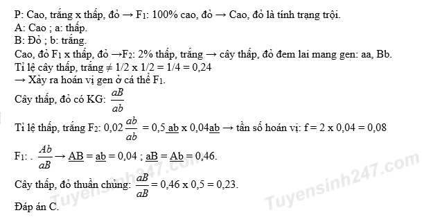 Cho cây thân cao, hoa trắng giao phấn với cây thân thấp, hoa đỏ (P), thu được F1 gồm 100% cây thân cao, hoa đỏ. Cho F1 giao phấn với cây thân thấp, hoa đỏ, thu được F2 có số cây thân thấp, hoa trắng chiếm 2%. Biết rằng mỗi gen quy định một tính trạng và không xảy ra đột biến. Theo lí thuyết, F2 có sổ cây thân thấp, hoa đỏ thuần chủng chiếm ti lệ