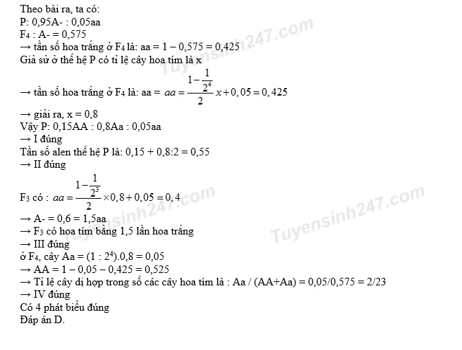 Một quần thể thực vật lưỡng bội, alen A quy định hoa tím trội hoàn toàn so với alen a quy định hoa trắng. Thế hệ xuất phát (P) của quần thể này có số cây hoa trắng chiếm 5%. Sau 4 thế hệ tự thụ phấn, thu được F4 có số cây hoa tím chiếm 57,5%. Biết rằng quần thể không chịu tác động của các nhân tố tiến hóa khác. Theo lí thuyết, có bao nhiêu phát biểu sau đây đúng?