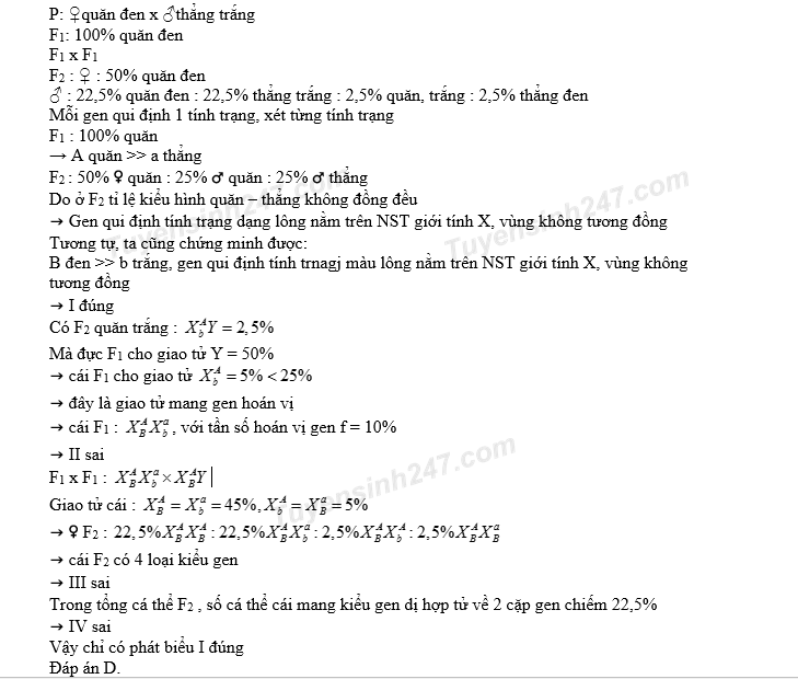 Một loài thú, cho cá thể cái lông quăn, đen giao phối với cá thề đực lông thẳng, trắng (P), thu được F1 gồm 100% cá thể lông quăn, đen. Cho F1 giao phối với nhau, thu được F2 có kiểu hình phân li theo tỉ lệ: 50% cá thể cái lông quăn, đen : 22,5% cá thể đực lông quăn, đen : 22,5% cá thề đực lông thẳng, trắng : 2,5% cá thể đực lông quăn, trắng : 2,5% cá thể đực lông thẳng, đen. Cho biết mỗi gen quy định một tính trạng và không xảy ra đột biến. Theo lí thuyết, có bao nhiêu phát biểu sau đây đúng?