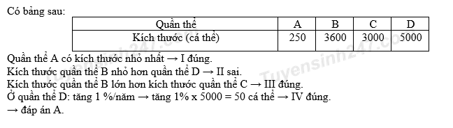 IV. Giả sử kích thước quần thể D tăng 1%/năm thì sau 1 năm, quần thể D tăng thêm 50 cá thể.