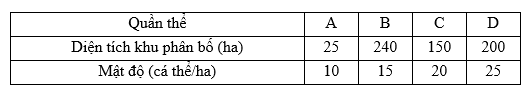 Giả sử 4 quần thể của một loài thú được kí hiệu là A, B, C, D có diện tích khu phân bố và mật độ cá thể như sau: