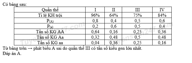Một loài sinh vật ngẫu phối, xét một gen có hai alen nằm trến nhiễm sắc thể thường, alen A trội hoàn toàn so với alen a. Bốn quần thể của loài này đều đang ở trạng thái cân bằng di truyền và có tỉ lệ cá thể mang kiểu hình trội như sau: