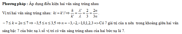 Trong thí nghiêm Y-âng về giao thoa ánh sáng, hai khe được chiếu bằng ánh sáng gồm hai thành phần đơn sắc có bước sóng λ = 0,6 µm và λ’ = 0,4 µm. Trên màn quan sát, trong khoảng giữa hai vân sáng bậc 7 của bức xạ có bước sóng λ, số vị trí có vân sáng trùng nhau của hai bức xạ là