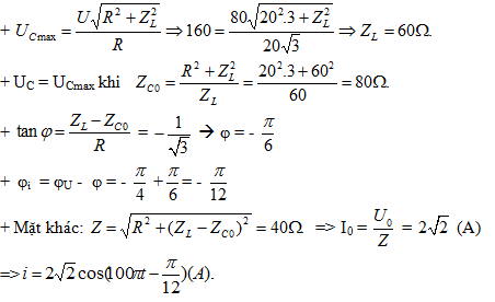 Đặt điện áp \(u = 80\sqrt 2 \cos (100\pi t - \frac{\pi }{4})(V)\) vào hai đầu đoạn mạch mắc nối tiếp gồm điện trở \(20\sqrt 3 \Omega \), cuộn thuần cảm và tụ điện có điện dung C thay đổi được Điều chỉnh điện dung đến giá trị C = C0 để điện áp dụng giữa hai đầu tụ điện đạt giá trị cực đại và bằng 160 V. Giữ nguyên giá trị C = C0 biểu thức cường độ dòng điện trong mạch đạt giá trị là