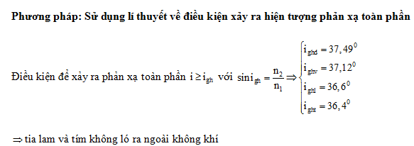 Chiếu một chùm sáng song song hẹp gồm bốn thành phần đơn sắc: đỏ, vàng, lam và tím từ một môi trưòng trong suốt tới mặt phẳng phân cách với không khí có góc tới 37°. Biết chiết suất của môi trường này đối với ánh sáng đơn sắc: đỏ, vàng, lam và tím lần lượt là 1,643; 1,657; 1,672 và 1,685. Thành phần đơn sắc không thể ló ra không khí là