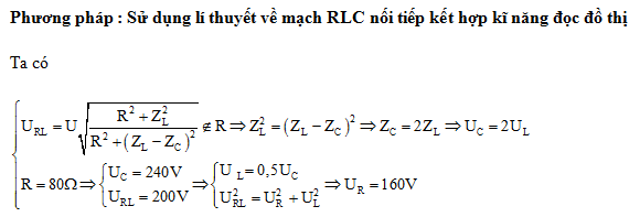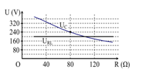 Đặt điện áp xoay chiều có giá trị hiệu dụng và tần số không đổi vào hai đầu đoạn mạch mắc nối tiếp theo thứ tự gồm biến trở R, cuộn cảm thuần L và tụ điện C. Gọi URL là điện áp hiệu dụng ở hai đầu đoạn mạch gồm R và L, UC là điện áp hiệu dụng ở hai đầu tụ điện C. Hình bên là đồ thị biểu diễn sự phụ thuộc của URL và UC theo giá trị của biến trở R. Khi giá trị của R bằng 80 Ω thì điện áp hiệu dụng ở hai đầu biến trở có giá trị là