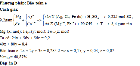 Cho 9,2 gam hỗn hợp X gồm Mg và Fe vào dung dịch hỗn hợp AgNO3 và Cu(NO3)2, thu được chất rắn Y (gồm 3 kim loại) và dung dịch Z. Hòa tan hết Y bằng dung dịch H2SO4 (đặc, nóng, dư), thu được 6,384 lít khí SO2 (sản phẩm khử duy nhất của S+6, ở đktc). Cho dung dịch NaOH dư vào Z, thu được kết tủa T. Nung T trong không khí đến khối lượng không đổi, thu được 8,4 gam hỗn hợp rắn. Biết các phản ứng xảy ra hoàn toàn. Phần trăm khối lượng của Fe trong X là