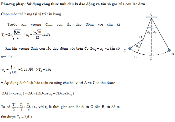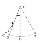Một con lắc đơn có chiều dài 1,92 m treo vào điểm T cố định. Từ vị trí cân bằng O, kéo con lắc về bên phải đến A rồi thả nhẹ. Mỗi khi vật nhỏ đi từ phải sang trái ngang qua B thì dây vướng vào đinh nhỏ tại D, vật dao động trên quỹ đạo AOBC (được minh họa bằng hình bên). Biết TD = 1,28 m và
