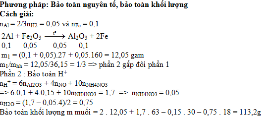Thực hiện phản ứng nhiệt nhôm hỗn hợp Al và Fe2O3 (trong điều kiện không có không khí), thu được 36,15 gam hỗn hợp X. Nghiền nhỏ, trộn đều và chia X thành hai phần. Cho phần một tác dụng với dung dịch NaOH dư, thu được 1,68 lít khí H2 (đktc) và 5,6 gam chất rắn không tan. Hòa tan hết phần hai trong 850 ml dung dịch HNO3 2M, thu được 3,36 lít khí NO (đktc) và dung dịch chi chứa m gam hỗn hợp muối. Biết các phản ứng xảy ra hoàn toàn. Giá trị của m gần nhất với giá trị nào sau đây?